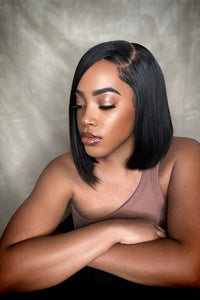 Bob with a slight Asymmetrical cut, unit using two bundle of 8 inch straight and 14 inch 5x5 lace closure. Can be worn glueless, or melted down. Customized for a sleek sexy cut. 100% human hair that holds a great curl and style. Larger size cap available upon request. Band and hair clip sewn in to secure and hold in place.